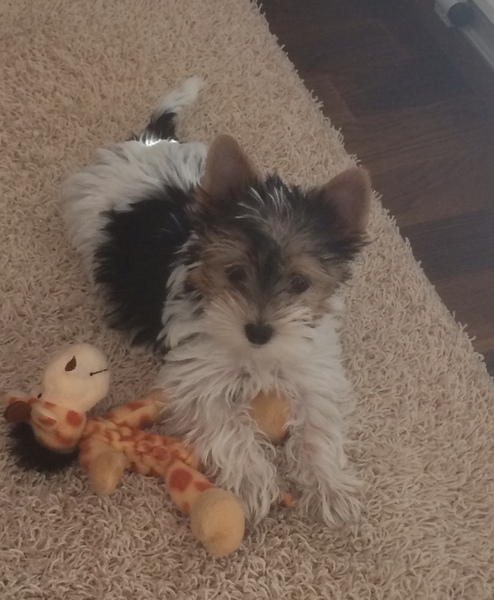 Von seiner Schönheit abgesehen, ist Rocky ein verschmuster und ein sehr kluger Biewer-Yorkshire. Von dem ersten Tag an, ging er gezielt auf die Unterlagen, hat sich draußen super wohl gefühlt und auf Anhieb mit unserem Tyson verstanden. Das Kommando Sitz und Platz hat er in Null Komma Nix gelernt, auf Nein sofort reagiert. Das Alleine bleiben ist für ihn kein Problem und er schimpft mit Tyson , wenn der anfängt zu jaulen (haben gefilmt). Dank ihm, bleiben die zwei schon für 2 Stunden alleine, was für uns früher gar nicht in Frage gekommen ist - Tyson musste überall mit. Die Zwei spielen die ganze Zeit miteinander und schlafen auch zusammen, allerdings beide mit uns im Bett :)